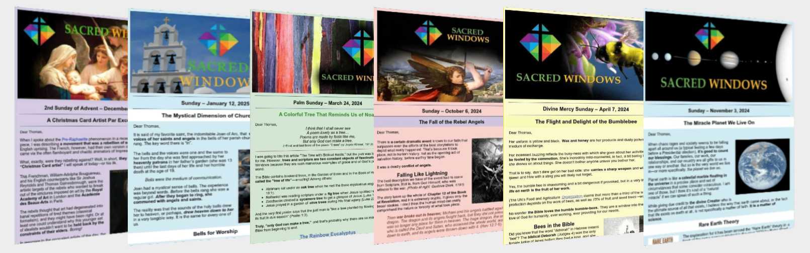 Launched on the First Sunday of Advent in December 2021, the Sacred Windows Newsletter teaches about the wonders of Nature, Art, and the Catholic Tradition using history, art, scripture, theology, saints, humor, and astonishing videos and images.